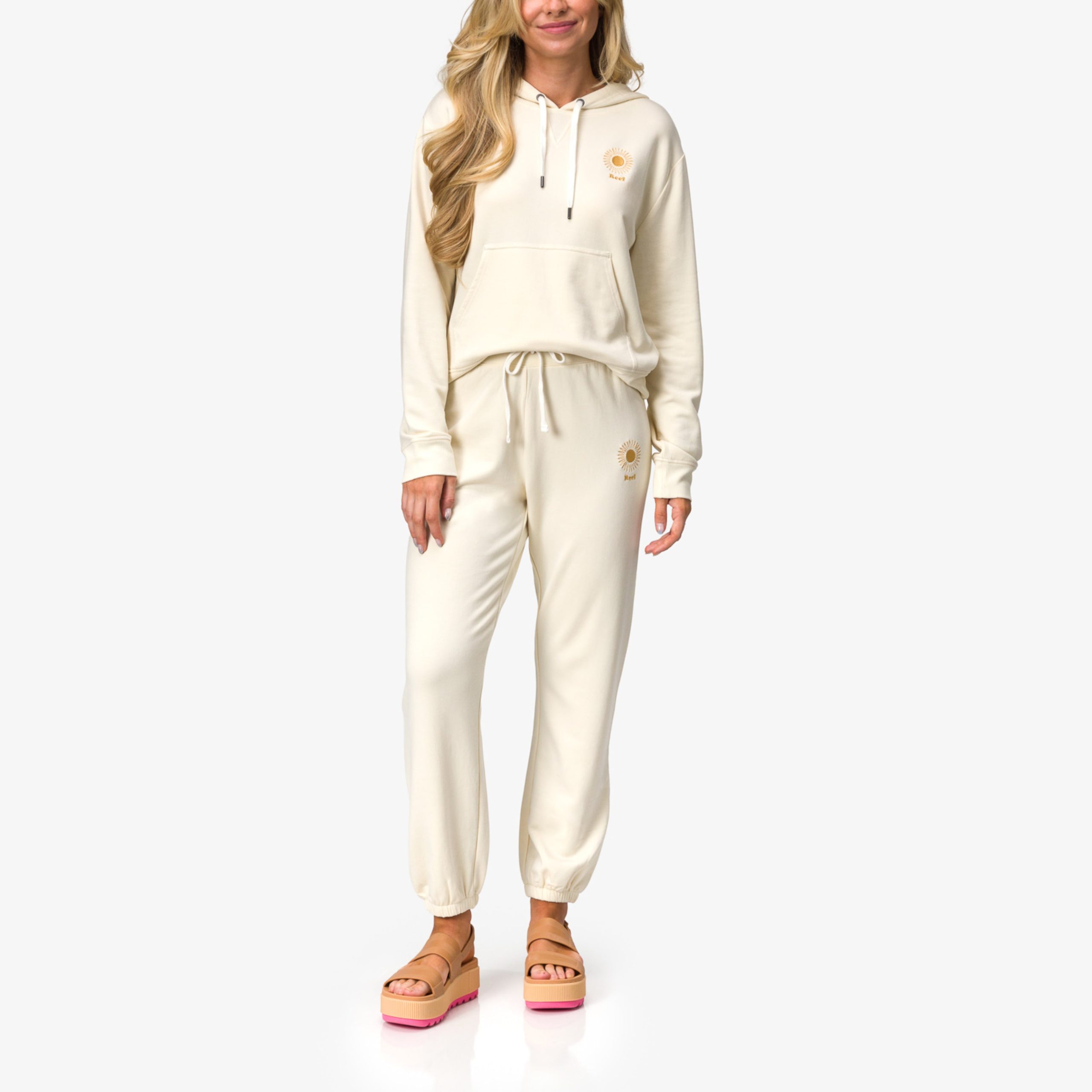 It’s called the Cozy Hooded Pullover for a reason. This quintessential hoodie is made with buttery soft fleece and features a creamy garment wash you’ll never want to take off. It features all the classic details like a drawstring hood. ribbed cuffs and hemline and a relaxed fit and is finished with a sunny embroidery.