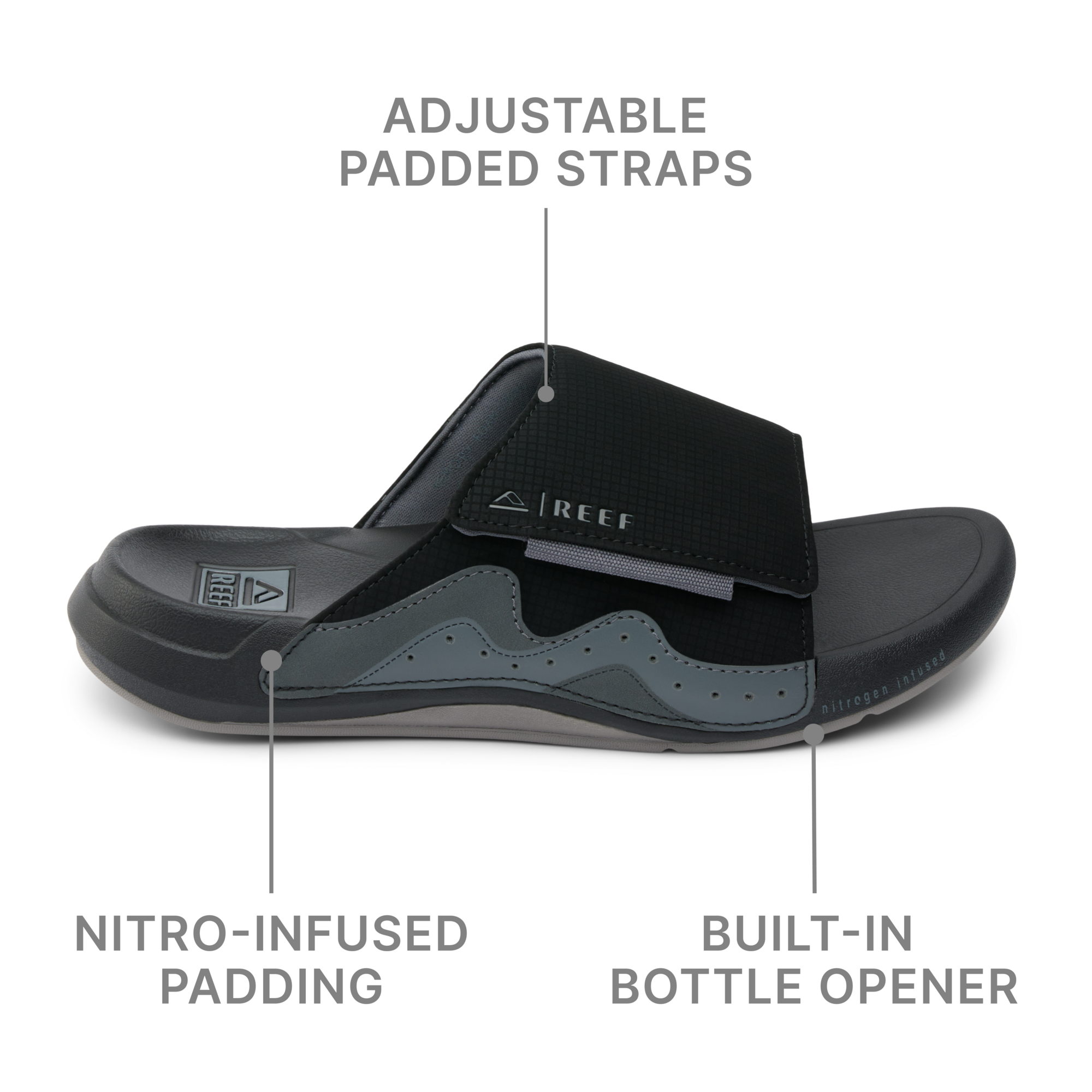 Taking comfort way over the top. the Cruiser Slide is ready to relax and recover. Built with our anatomical footbed from super cushy nitrogen-infused EVA. this slide reduces pressure points and provides rebounding performance comfort after intense workouts. long workdays. or when your feet just need a break. And to make sure you can truly unwind. we’ve built-in our signature bottle opener for liquid relaxation.